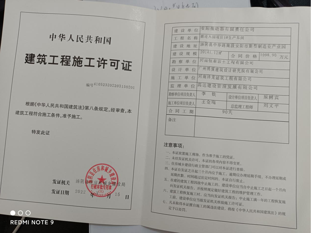 安陽振動(dòng)器有限責(zé)任公司獲得新廠建設(shè)施工許可證